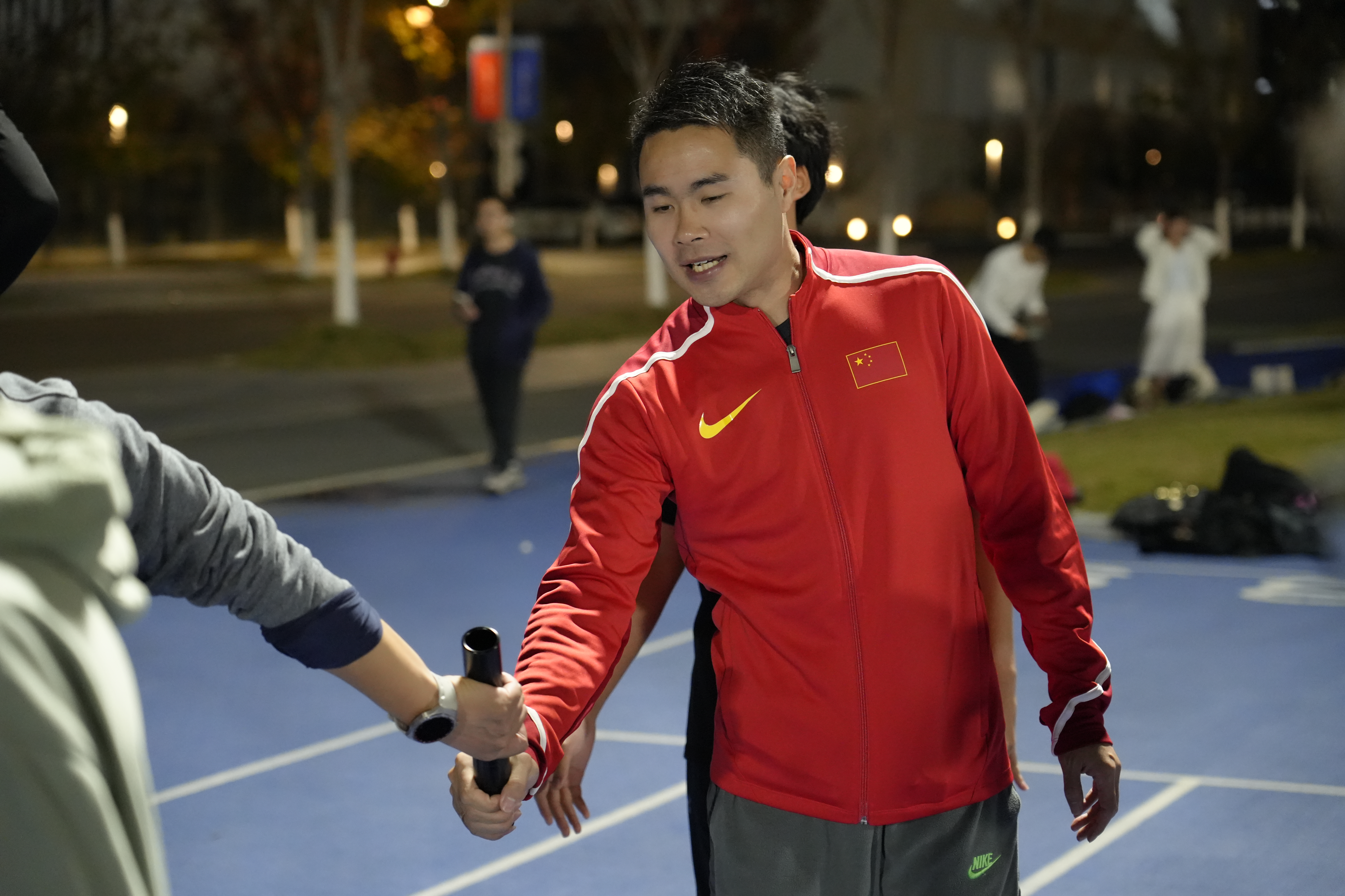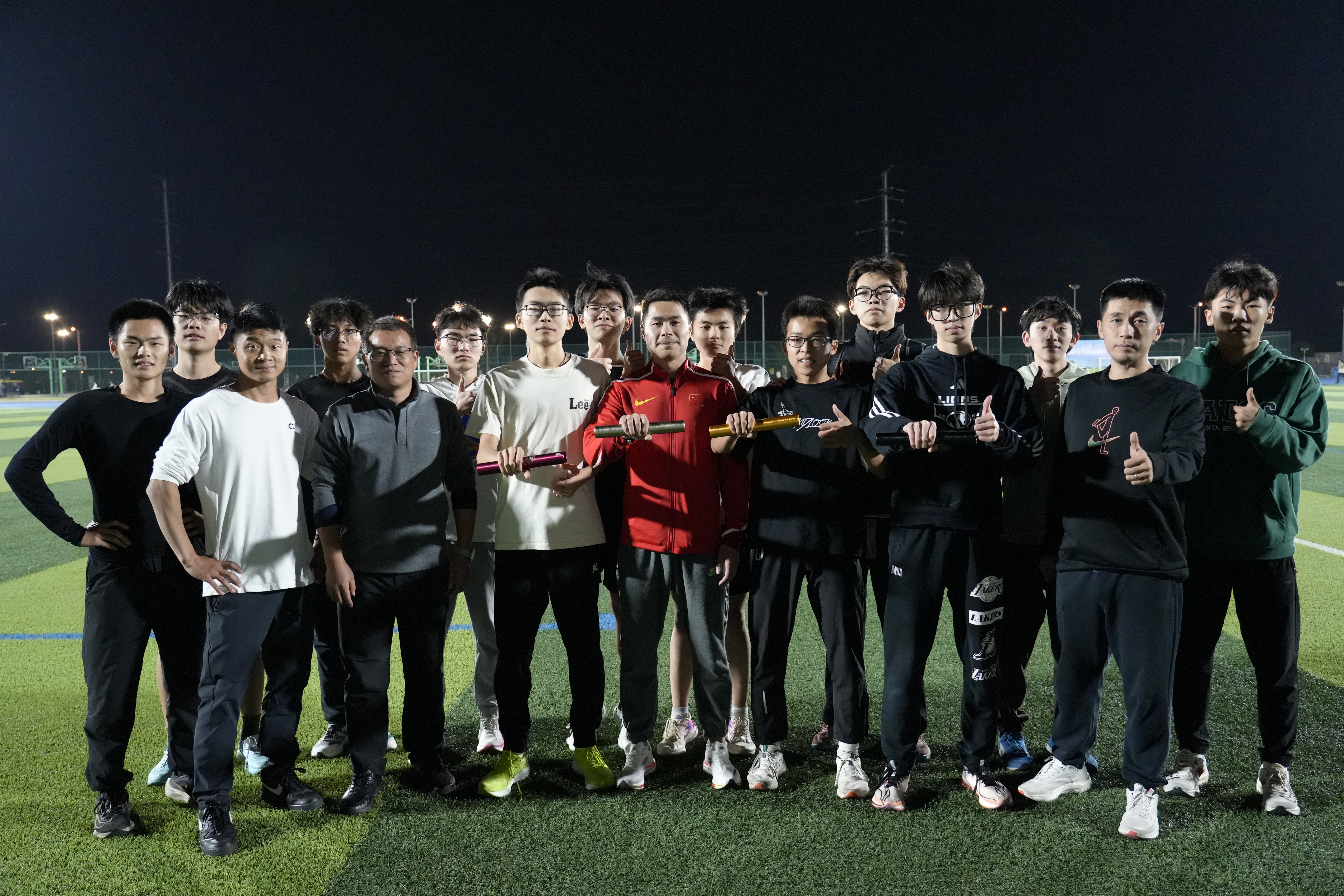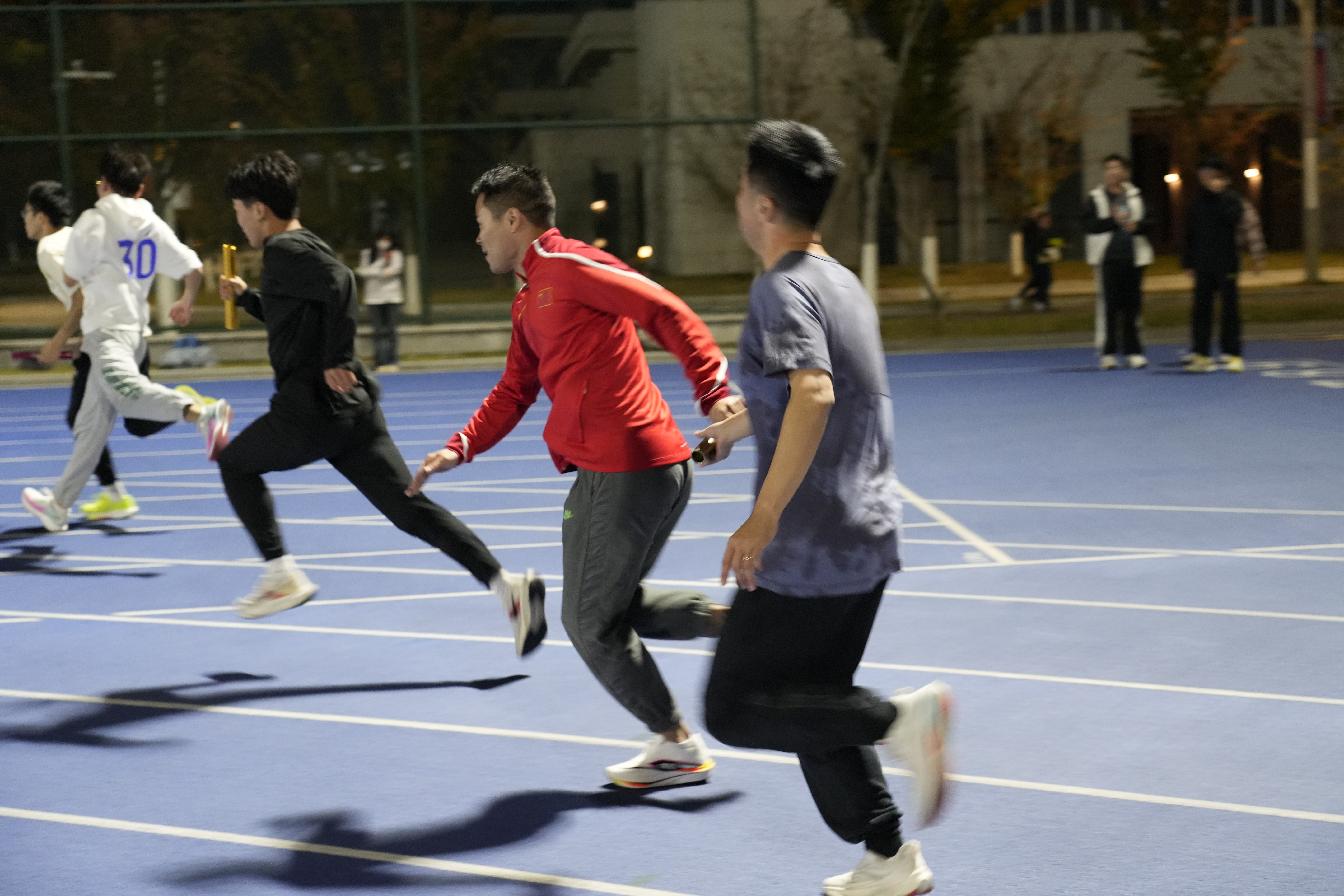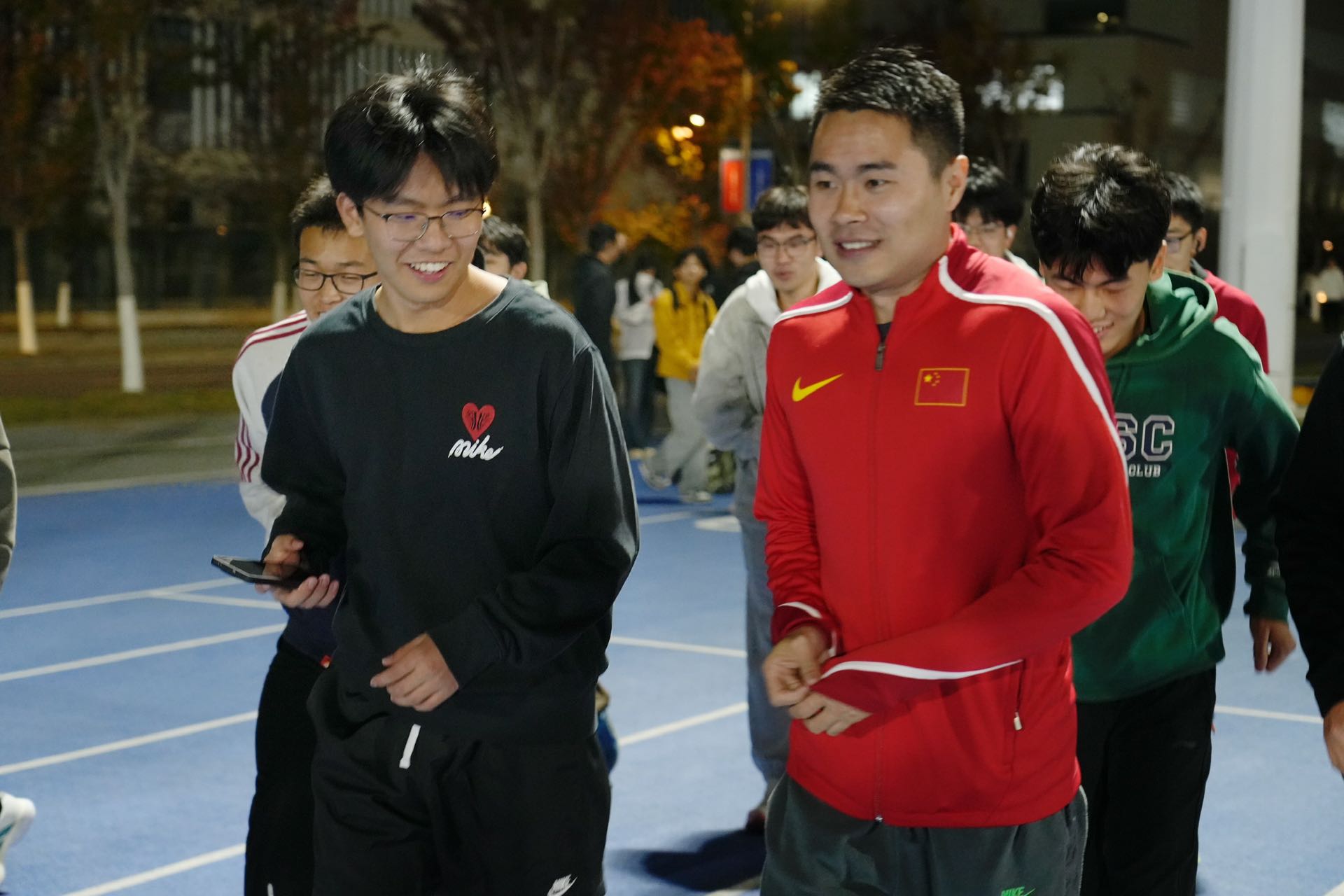 分享环节后,在徐海洋的带领下,同学们以“牧星一公里”活动进行了热身。随后徐海洋亲身向同学们示范指导4×100米接力的动作要领——从起跑时的蹬摆协调、接棒时的视线配合,到交棒瞬间的稳准衔接,他耐心纠正每一个细节,用通俗易懂的讲解和标准动作,让大家快速掌握核心技巧。指导结束后,徐海洋带领同学们进行了一场紧张又欢乐的4×100米接力比赛。同学们分组上阵,赛道上呐喊声、欢呼声此起彼伏。赛后,徐海洋与同学们交流互动,现场氛围热烈又温馨,这份与榜样近距离接触的经历,也成为同学们此次活动中难忘的回忆。